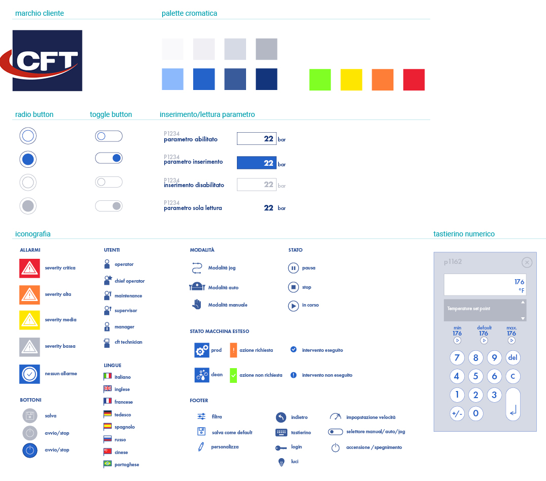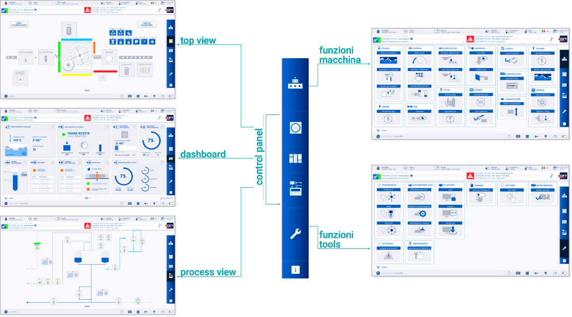 Since CFT produces different machines starting from similar modules variously configurated, the goal was to design an HMI composed by modular elements and a object/function-based navigation. In the gui design, we wanted to achieve three fundamental goals: flexibility of use, not only to easily configurate the interface according to the specific machine, but also the possibility to create a customizable dashboard that allows the user to chose which widgets visualize for a quick overview of the main parameters, so that it is no longer necessary to search the informations inside the interface nesting. The last goal concerned the necessity to develop a visual system that could help the user not to get lost, and also not to cause misunderstandings of doubts of interpretation.