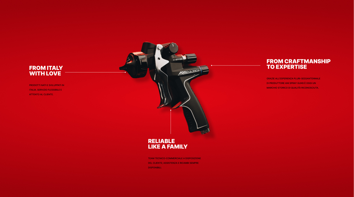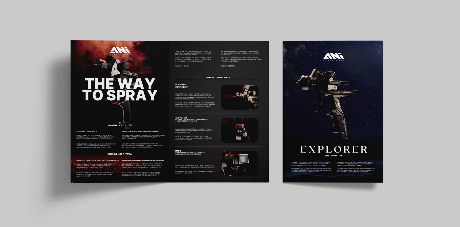 A.N.I. is an Italian company that has been producing professional spray guns for more than half a century. A.N.I. turned to Visualcom for the development of the new communication for the Spray Guns product line, including the identity and design of a limited-edition spray gun, with the aim of creating a strong identity image and an incisive, less technical and more emotional message that could differentiate the company from its competitors.