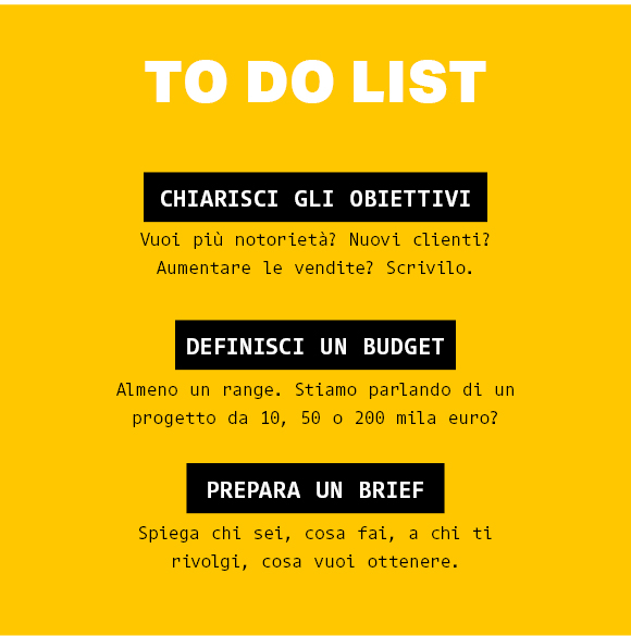 1. Chiarire gli obiettivi – Non devono essere perfetti, ma almeno concreti: vuoi più notorietà? Nuovi clienti? Aumentare le vendite? Scrivilo. 2. Stabilire un budget indicativo – Non è ancora un preventivo, ma un range. L’agenzia deve sapere se stiamo parlando di un progetto da 10, 50 o 200 mila euro. 3. Preparare un brief – Un documento semplice (anche 2 pagine) che racconta chi sei, cosa fai, a chi ti rivolgi, cosa vuoi ottenere.