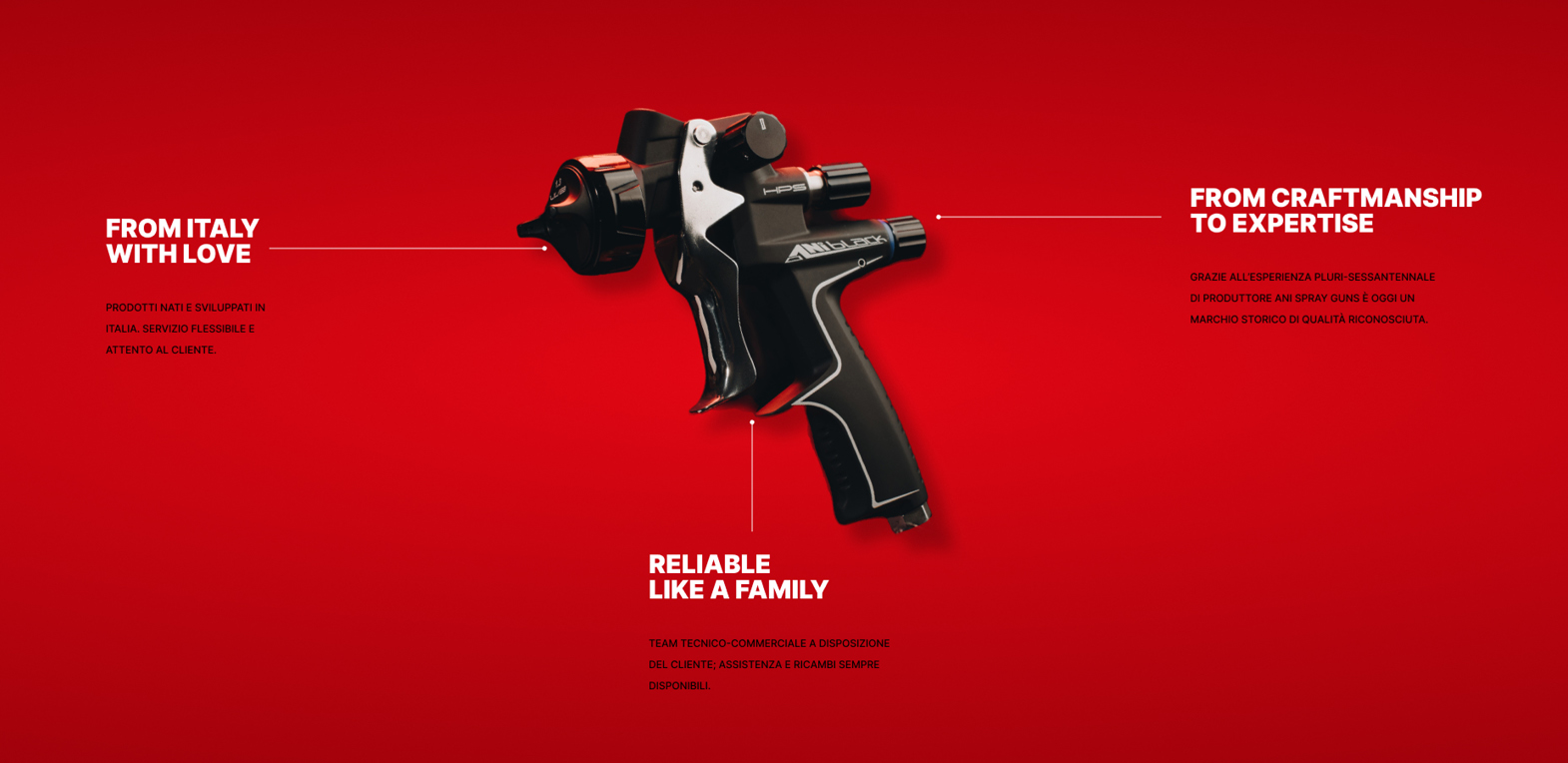 Il sito dedicato alla divisione Spray Guns è stato pensato per essere il cuore pulsante del nuovo sistema comunicativo. Animazioni fluide, video immersivi e immagini ad alto impatto creano un’esperienza di navigazione dinamica e coinvolgente. Ogni dettaglio è stato progettato per riflettere i valori del brand, senza mai perdere di vista funzionalità e usabilità.