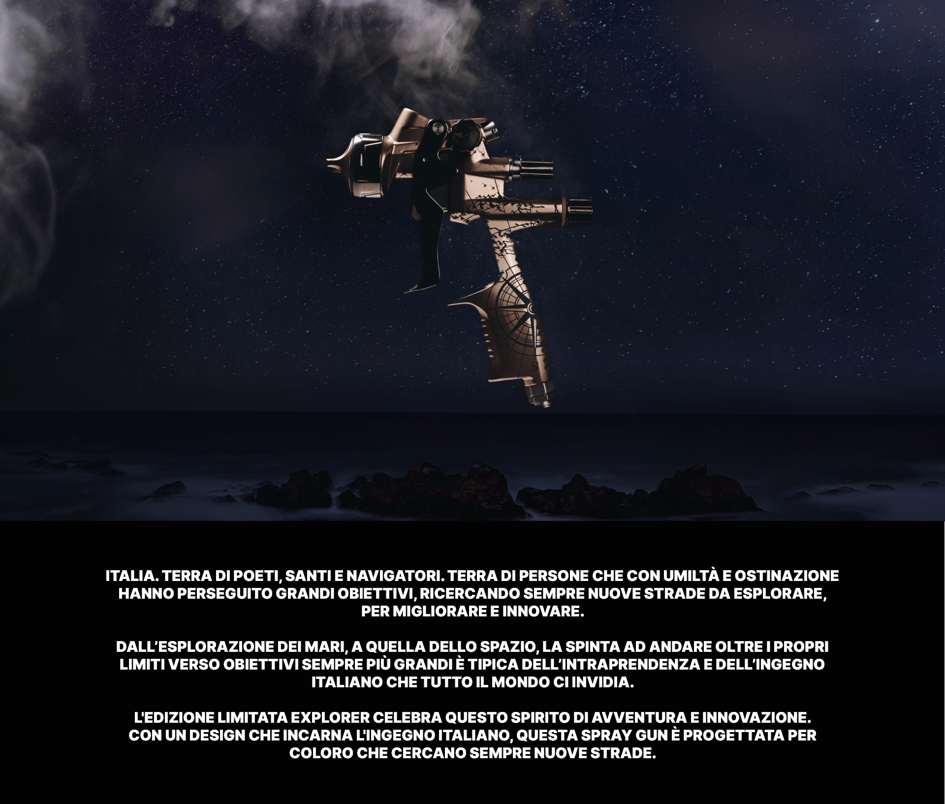 Tra i momenti chiave del progetto, c’è lo sviluppo dell’aerografo in edizione limitata EXPLORER, che incarna l’attitudine pionieristica del brand. Le grafiche ispirate a mappe cartografiche e cieli stellati celebrano l’inarrestabile curiosità e l’ingegno italiano, unendo memoria storica e tensione verso l’ignoto. Il risultato è un oggetto simbolico che comunica identità, visione e valore.