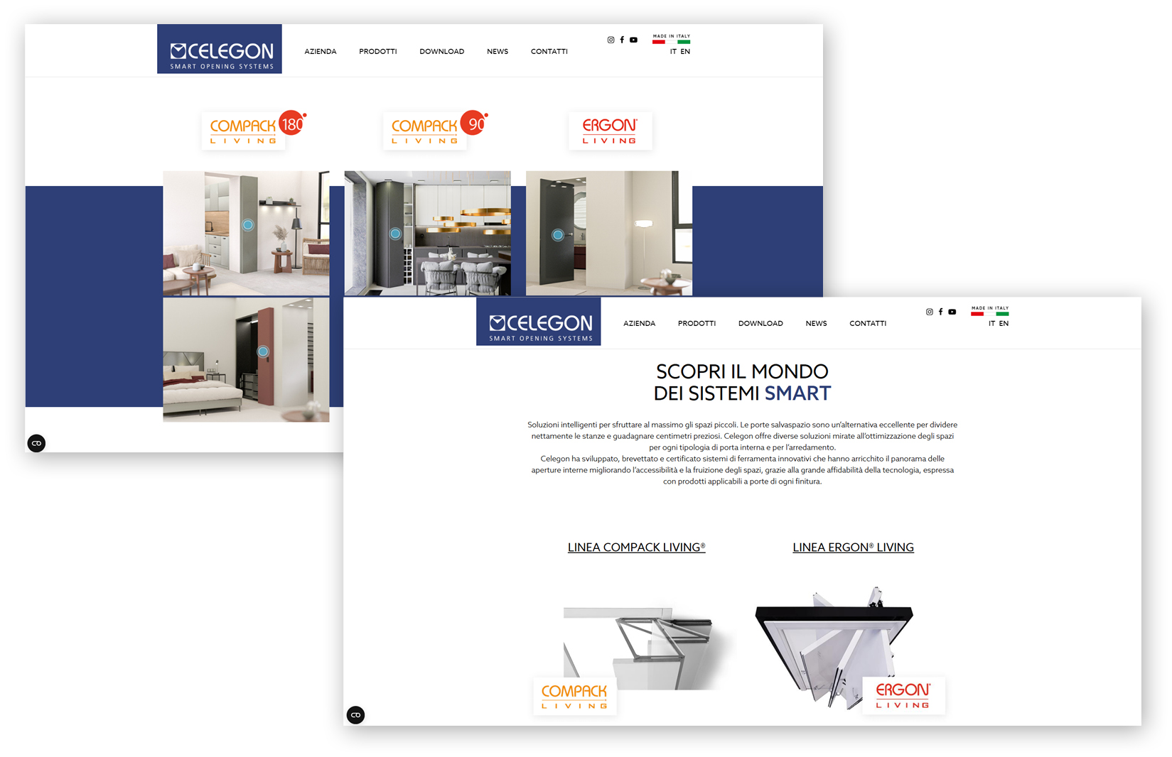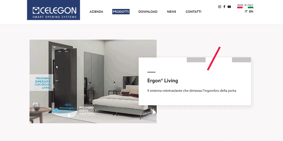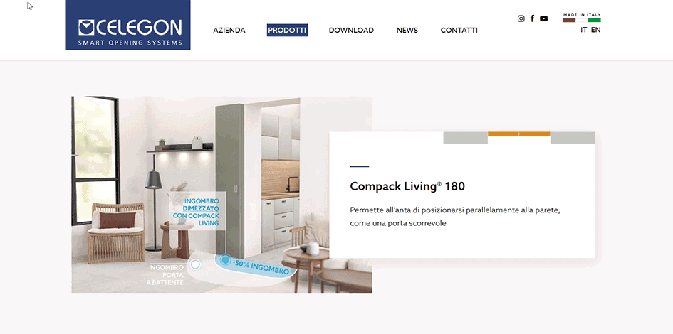 Dal menu a tendina alla sezione prodotti, l’utente viaggia ora in modo intuitivo tra Compack Living®, Ergon® Living e tutte le linee Celegon, guidato da render interattivi e GIF dinamiche che mostrano il movimento reale delle porte. Niente più icone statiche o descrizioni astratte: ogni meccanismo prende vita in vista aerea e in ambientazione domestica, evidenziando la differenza di ingombro rispetto alle cerniere tradizionali.