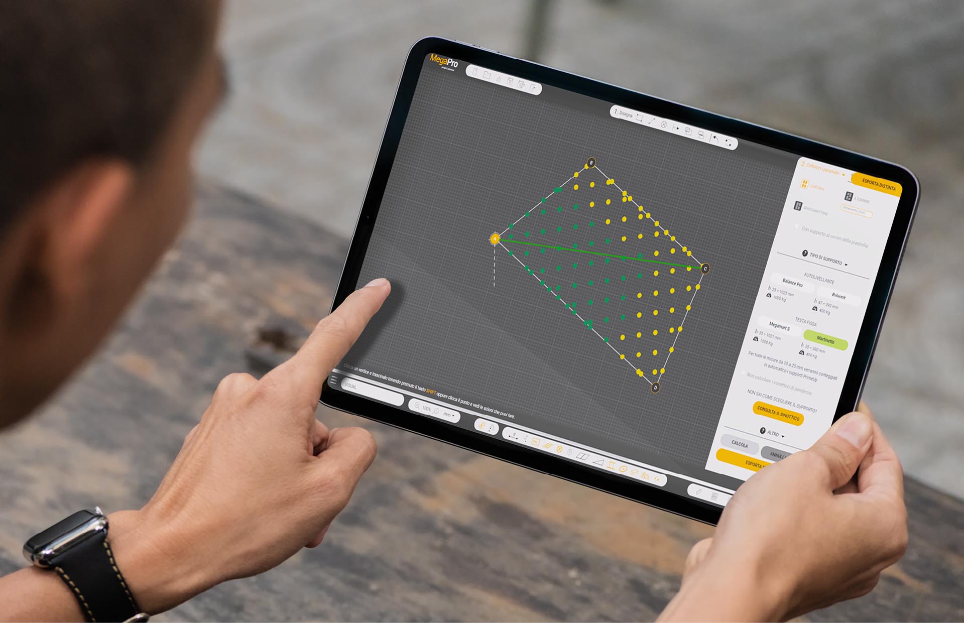 Nella palette laterale, l’utente può impostare ogni variabile del progetto: misure, tipologia di posa, tipo di superficie e modello di supporto Impertek.