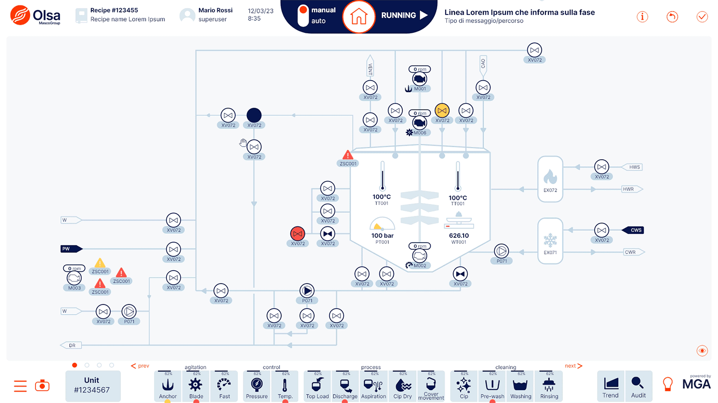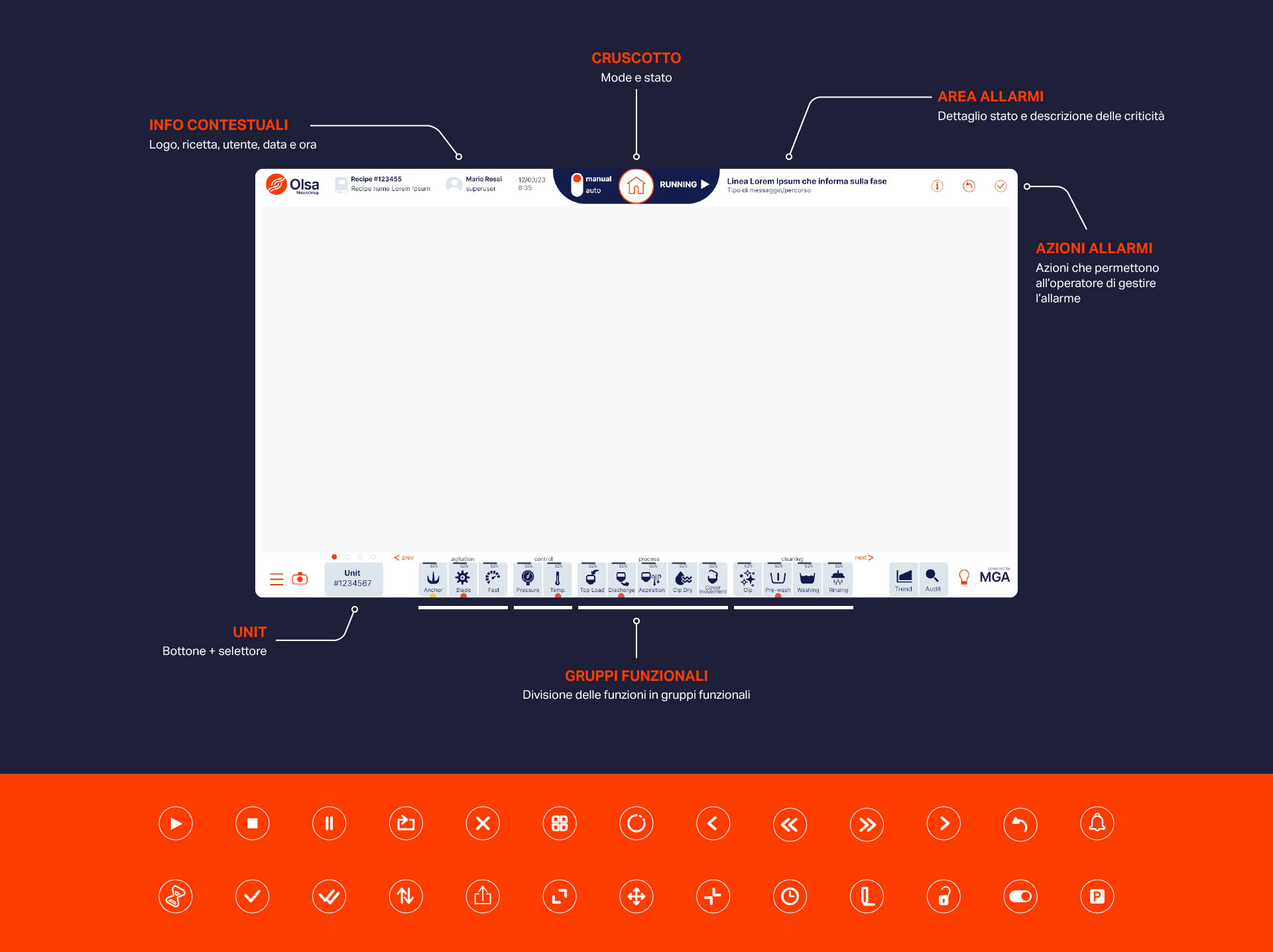 Il progetto è nato come iniziativa di innovazione interna al gruppo, con l’obiettivo di creare un nuovo standard grafico per le interfacce MGA e Olsa. Abbiamo analizzato a fondo l’HMI esistente, sezionando struttura, flussi e priorità operative per capire cosa mantenere e cosa riscrivere da zero. Da questa base è emersa una necessità chiara: dare una forma visiva alla logica funzionale, eliminando ridondanze e ambiguità per lasciare spazio a un’esperienza d’uso più lineare.