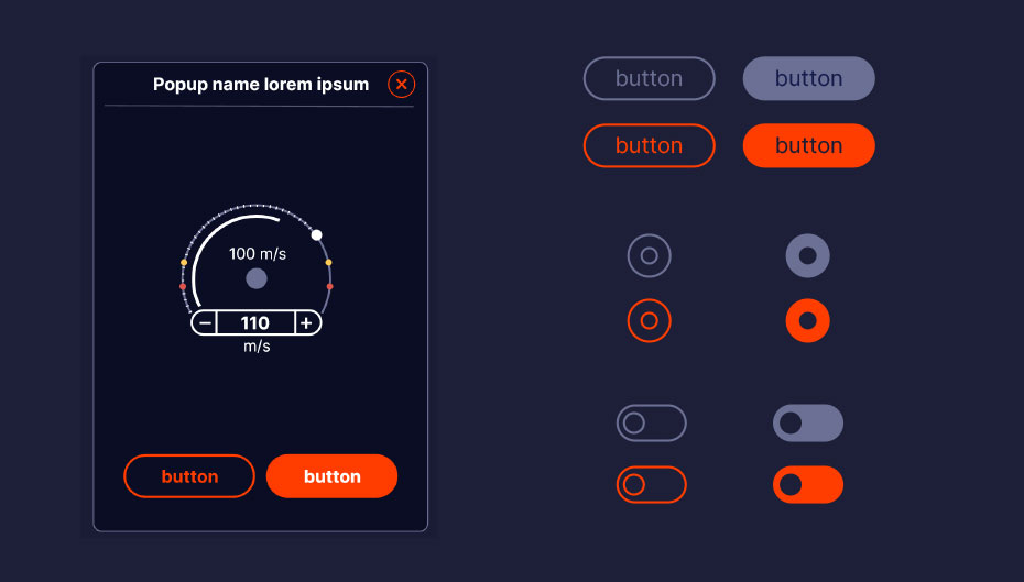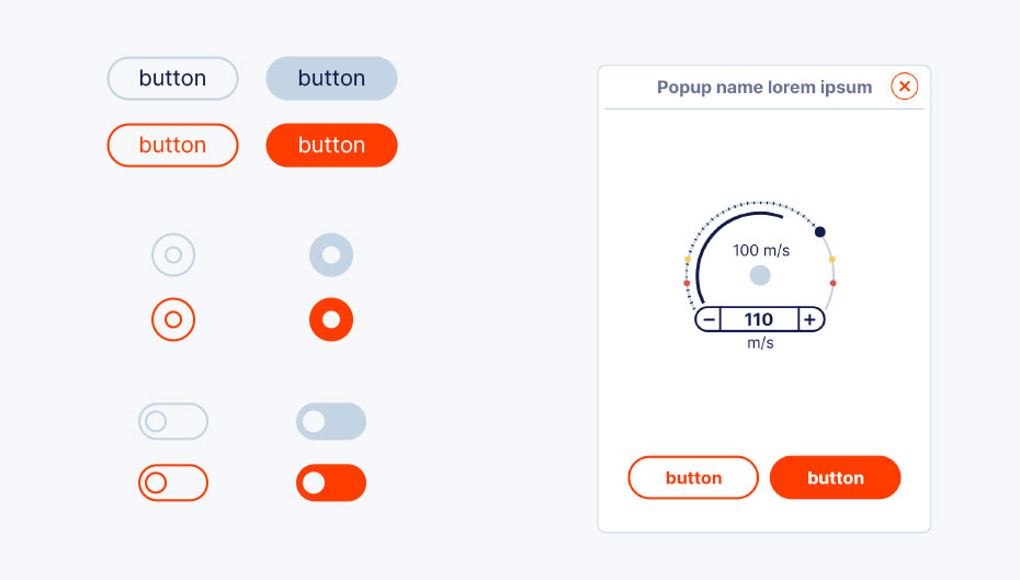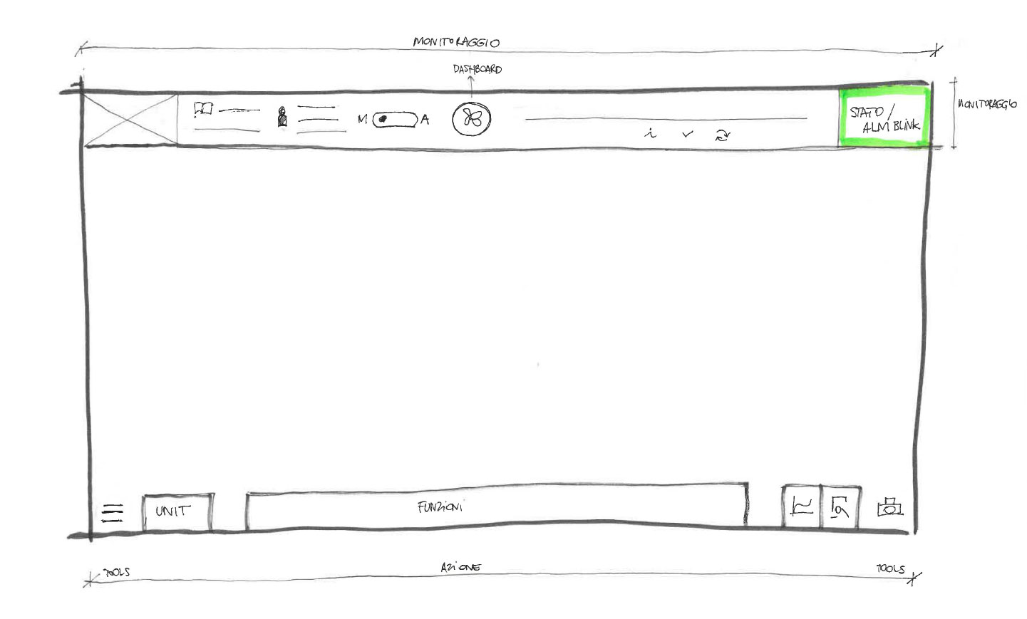 Abbiamo iniziato da una mappa logica dei percorsi utente, sintetizzata nei primi wireframe. Da lì, abbiamo definito un menu funzioni sempre visibile nella parte inferiore dello schermo, pensato per essere usabile da mancini e destrimani. La top bar invece è stata dedicata al monitoraggio: le informazioni più dinamiche in alto, i pulsanti ad alta interazione spostati sulla destra per evitare di oscurare la vista durante l’uso operativo. Ogni dettaglio è stato progettato con un principio in mente: facilitare la concentrazione dell’operatore.